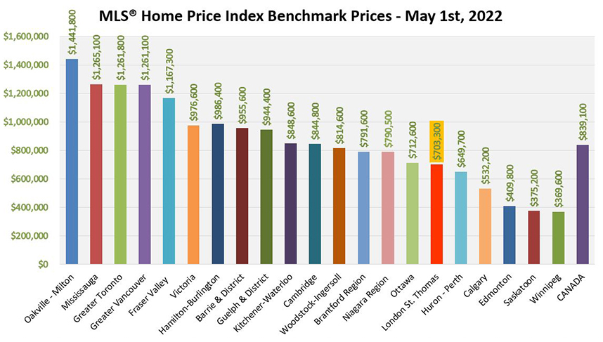 “Even if it’s higher than in many cities from other Canadian provinces, LSTAR’s composite HPI benchmark price places our area among the most affordable in Ontario,” Pawlowski observed. The following chart is based on data provided by the Canadian Real Estate Association (CREA) for May 1st, 2022.