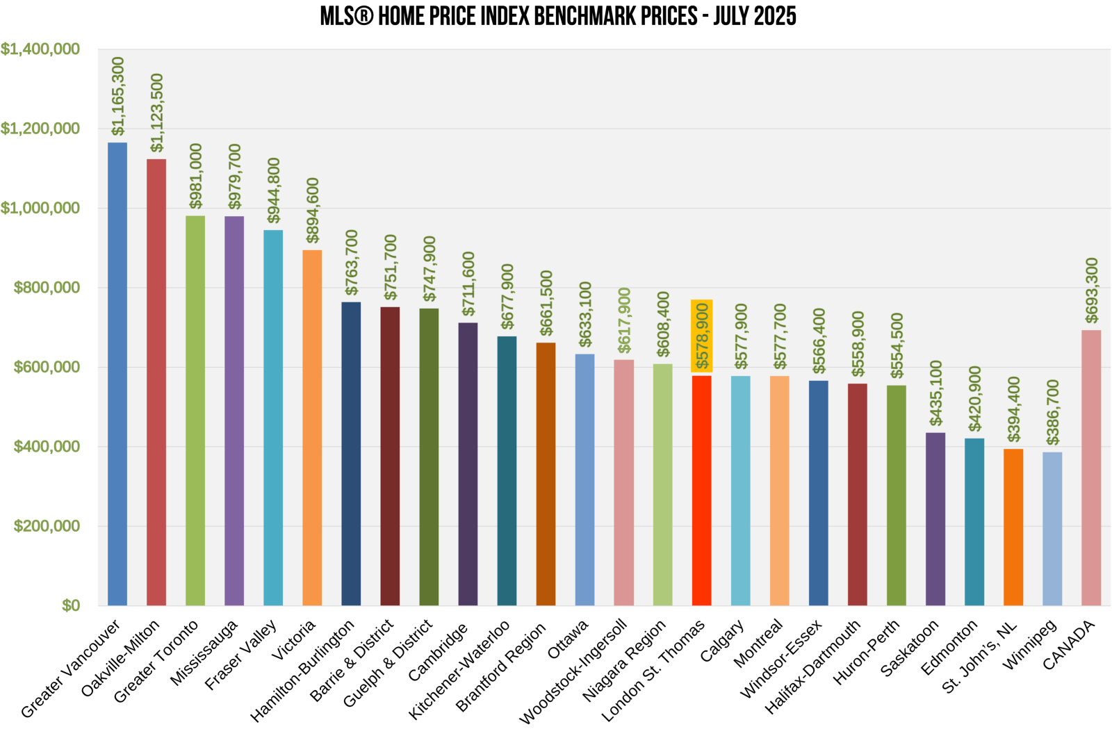 The chart below shows the most recent HPI benchmark prices across the country, courtesy of CREA. “When compared to other provincial and national centres, homes within LSTAR’s region appear competitive for buyers,” Marsh said.