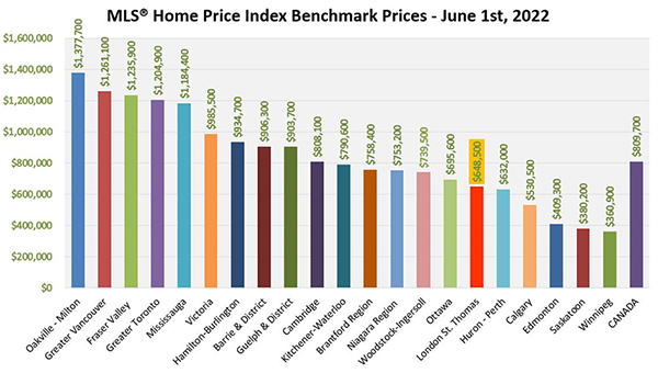 “Even if it’s higher than in many cities from other Canadian provinces, LSTAR’s composite HPI benchmark price places our area among the most affordable in Ontario,” Pawlowski observed. The following chart is based on data provided by the Canadian Real Estate Association (CREA) for June 1st, 2022.