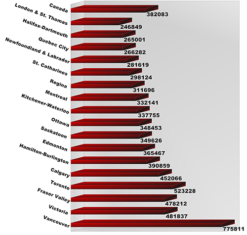 The following chart, based on data taken from CREA's National MLS® Report for August 2013 (the latest information available), demonstrates how homes in LSTAR's jurisdiction continue to maintain their affordability compared to other major Ontario and Canadian centers.